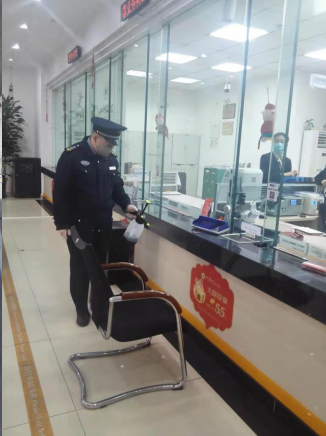 銀行保安隊(duì)員對(duì)營(yíng)業(yè)場(chǎng)所進(jìn)行消毒